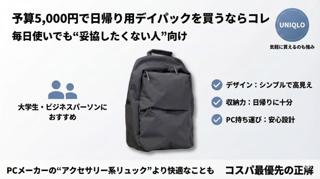 予算5,000円前後で日帰り用のデイパックを選ぶなら、ユニクロのファンクショナルバックパックはかなり有力です。