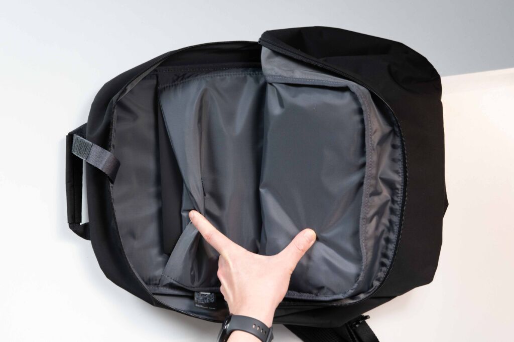 ノートPCの収納部には厚めのクッションが入っており、持ち運び時の安心感があります。サイズ感としては、13.3型のモバイルノートPCから、16型クラスのスタンダードノートPCまで収納できる印象です。