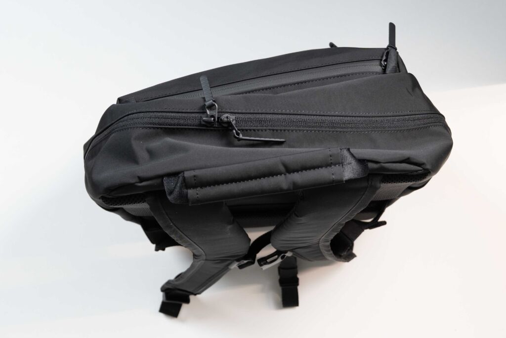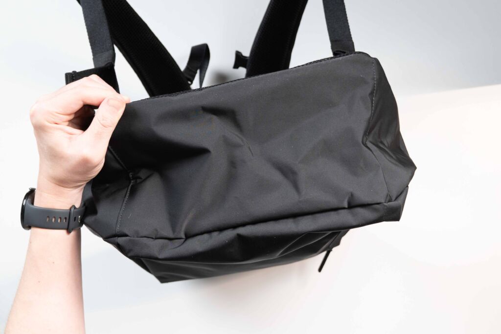 底面はマチがしっかり確保されているため、見た目以上に荷物が入ります。PCに加えて、充電器やポーチ、ペットボトルなどもまとめて入れやすく、日帰り用途のメインバッグとして十分な収納力があります。