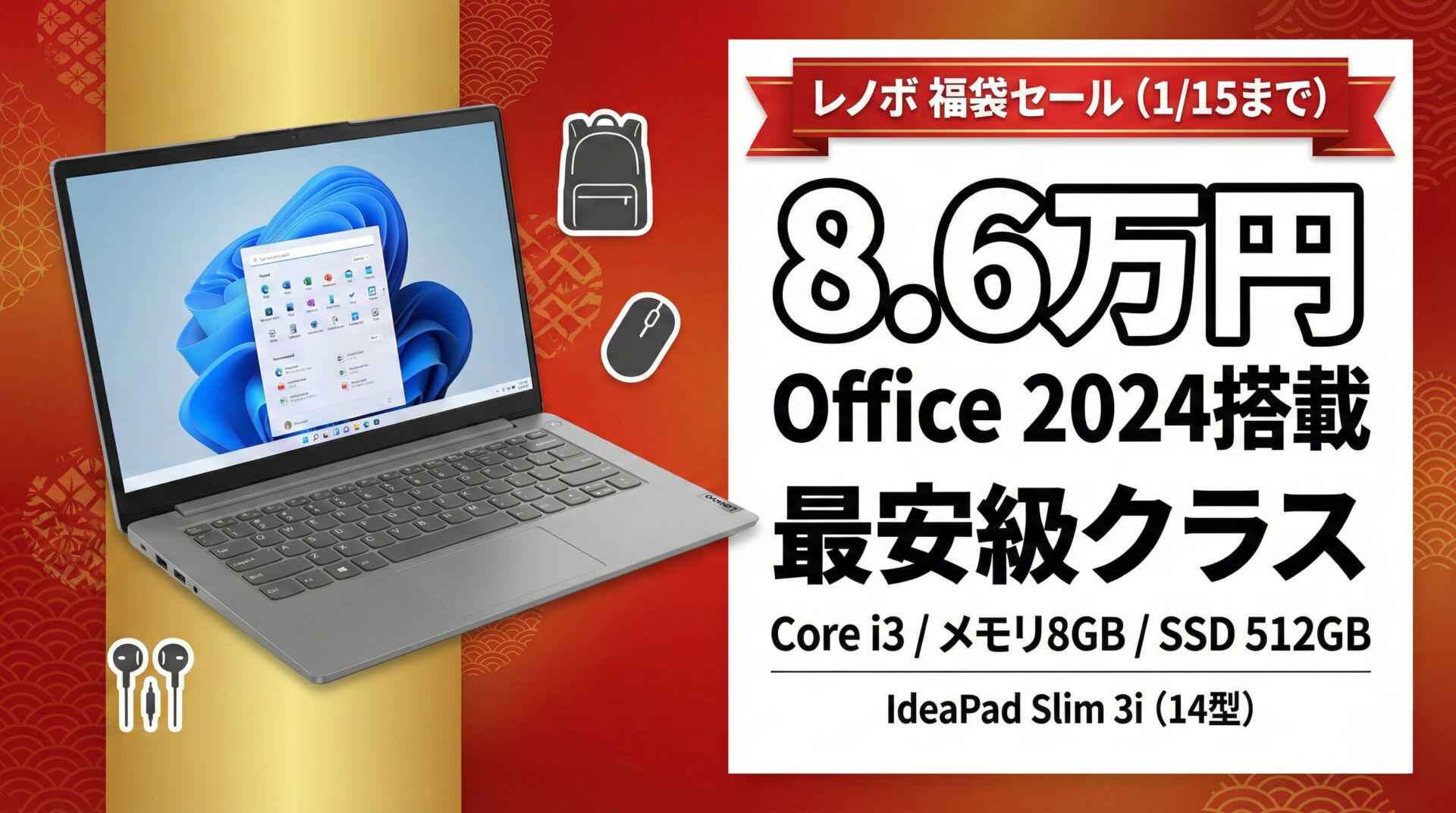 1月15日まで:MS Office付きで8.6万円は激安。Lenovo「お買い得PC福袋」でIdeaPad Slim 3i Gen 8(14型)が最安級