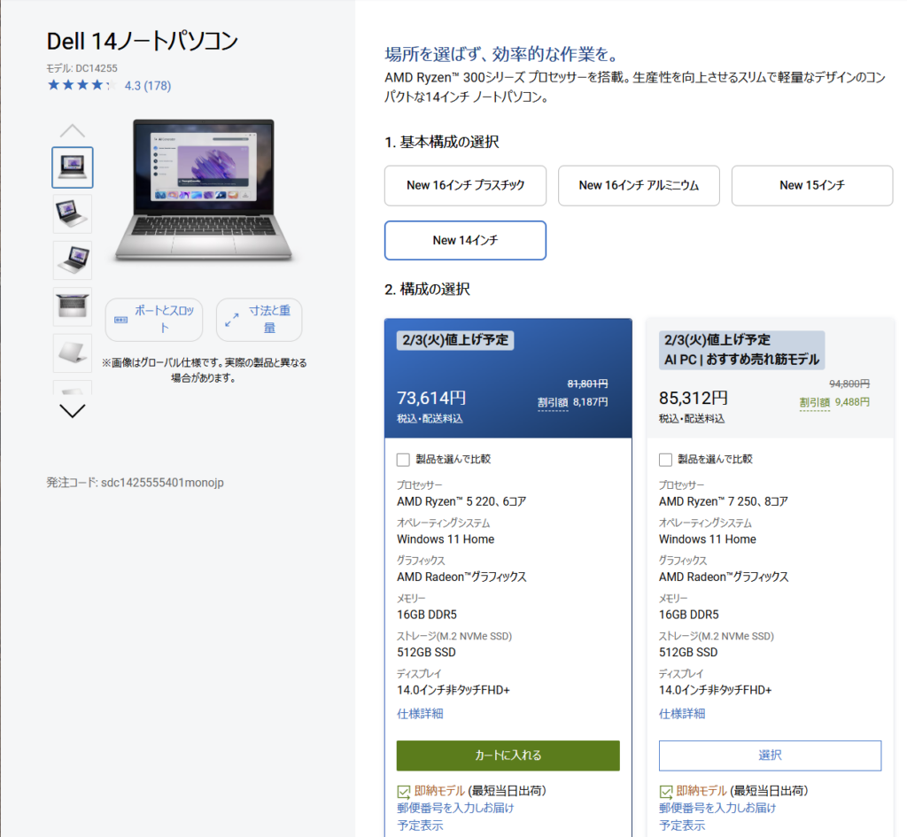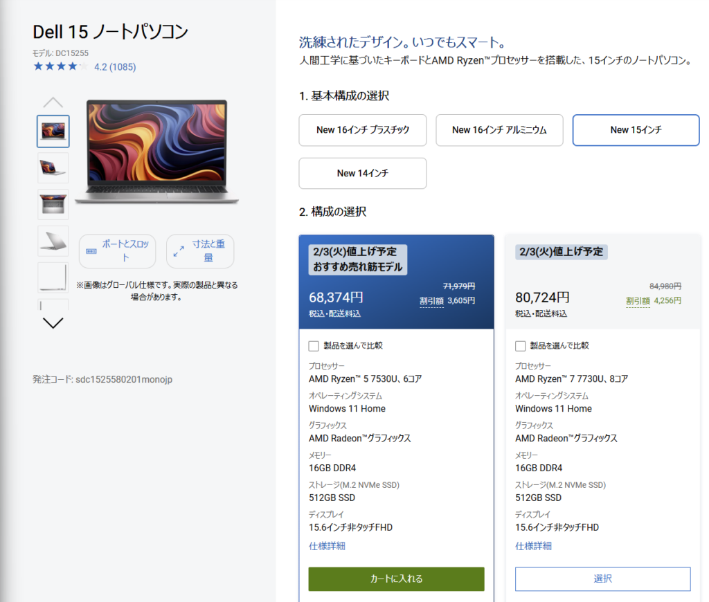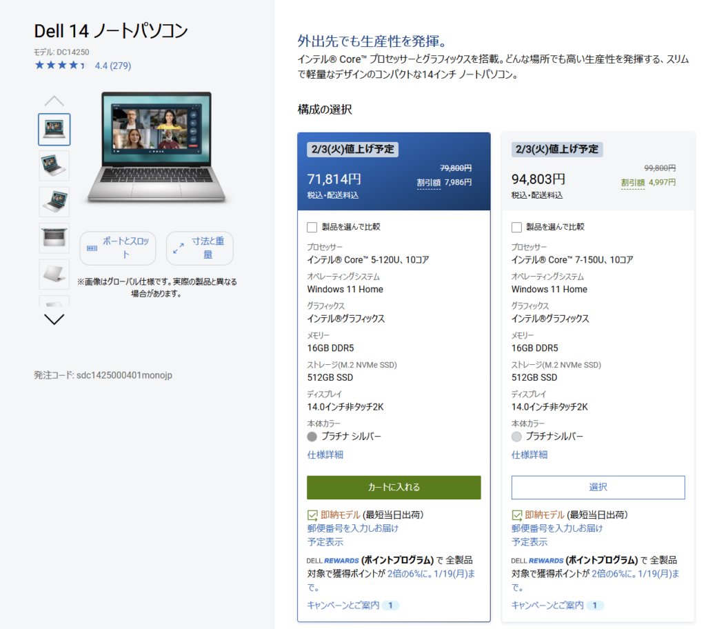 ※Dell側は2月3日(火)から一部PCが値上げ予定とも案内しているので、買うなら“今”が素直に安全です。