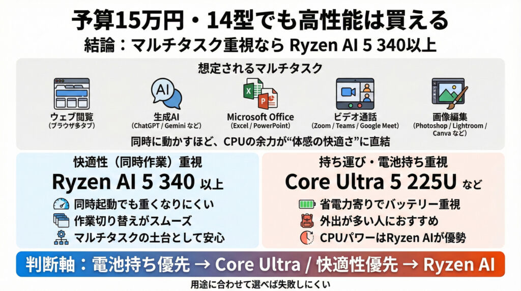 要するに判断軸はシンプルで、「持ち運び・電池持ち重視ならCore Ultra 5 225U」/「同時作業の快適性重視ならRyzen AI 5 340以上」。