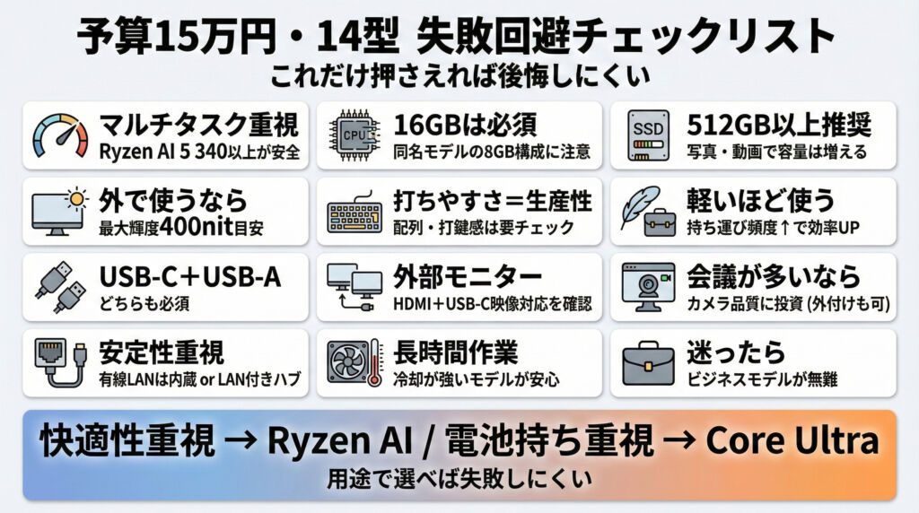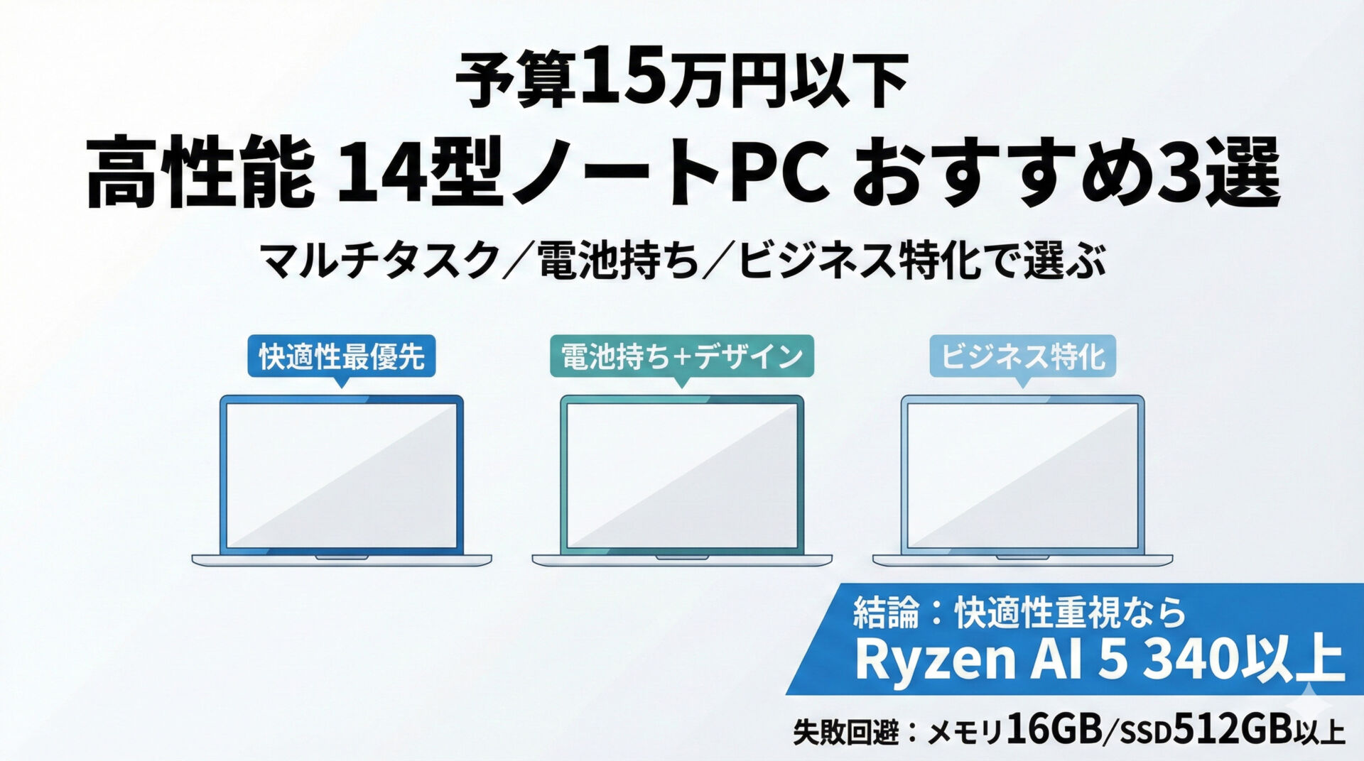 予算15万円の14型でも、Ryzen AI 5 340クラスを選べば「重くなりにくい土台」を作れます。