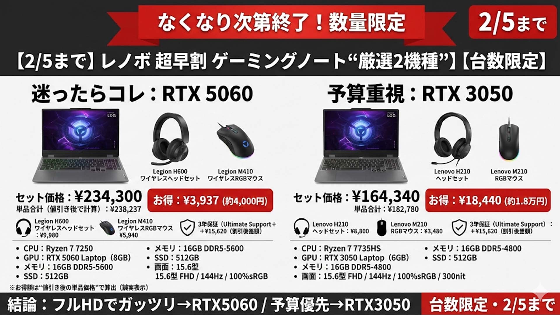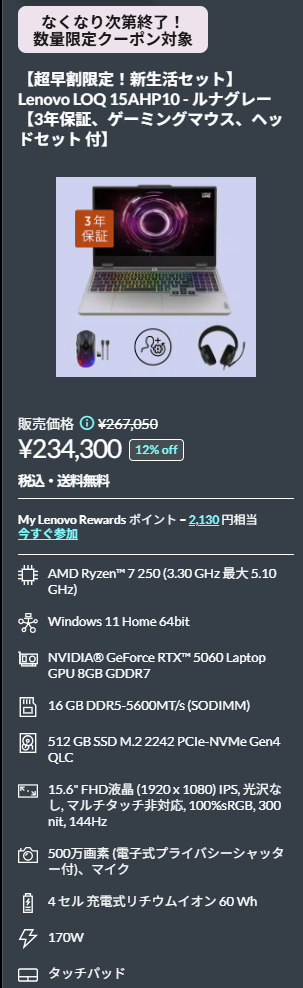 Lenovo LOQ 15AHP 10(RTX 5060)超早割セットはどれくらいお得?