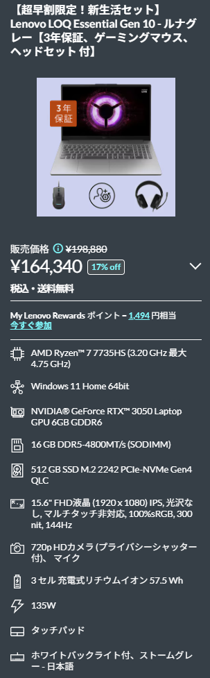 Lenovo LOQ Essential Gen 10:セットはどれくらいお得?