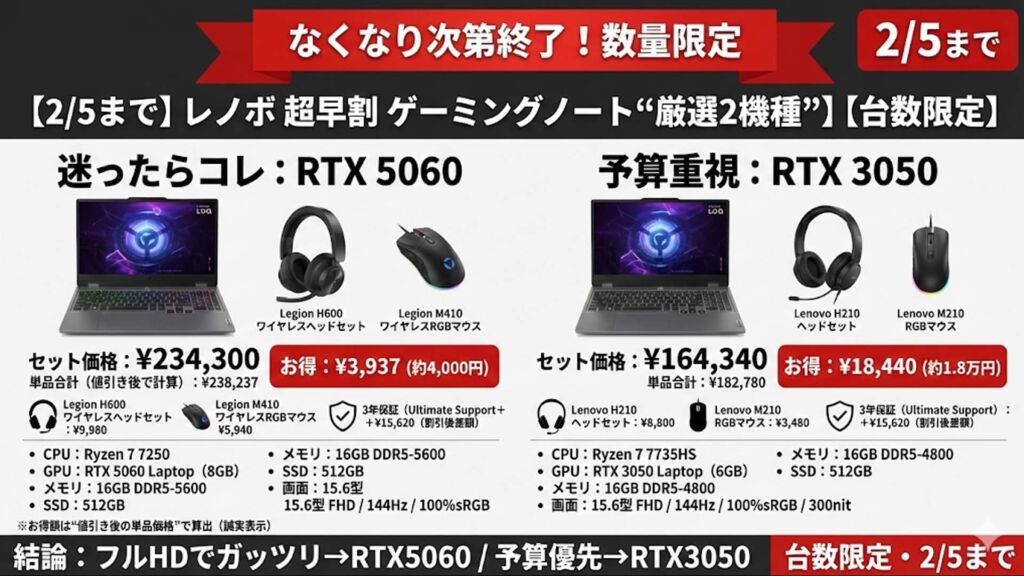 今回は2月5日までの期間限定で、価格と性能のバランスが良いおすすめ2機種を厳選しました。ゲーミングノートの購入を検討している方は、在庫がなくなる前にチェックしてください。