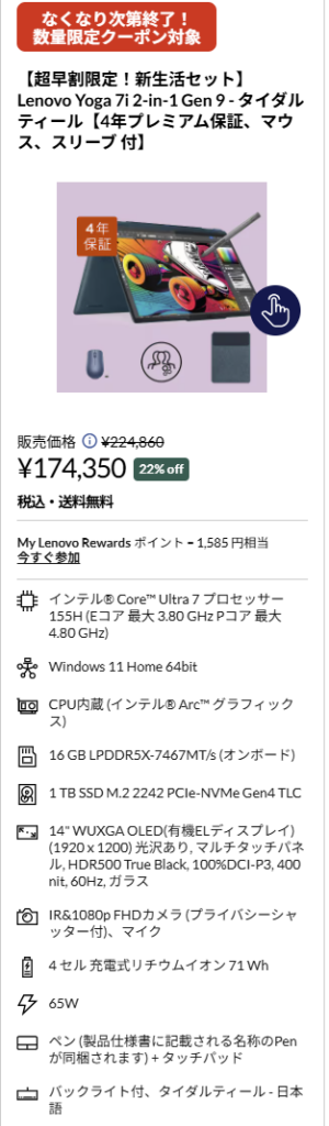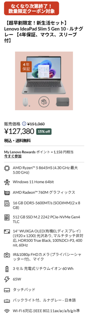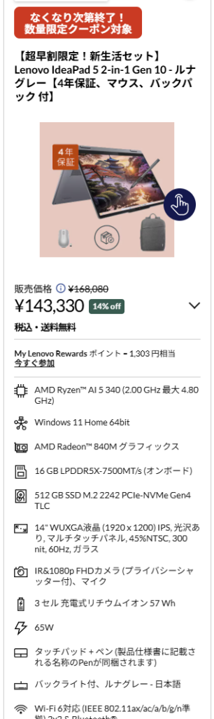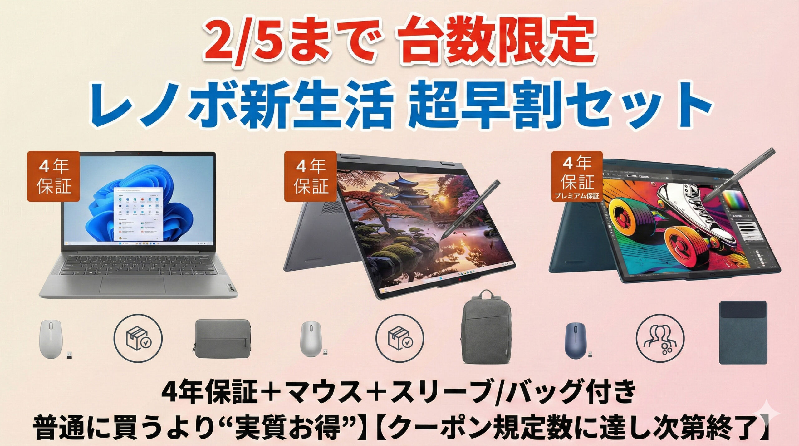 レノボ公式で「新生活超早割セール(〜2/5)」が開催中です。今回のポイントは、本体+周辺機器+長期保証(4年)が“セット価格”で出ていること。さらに数量限定のクーポンが絡むため、条件が合うなら早めに押さえるのが合理的です。