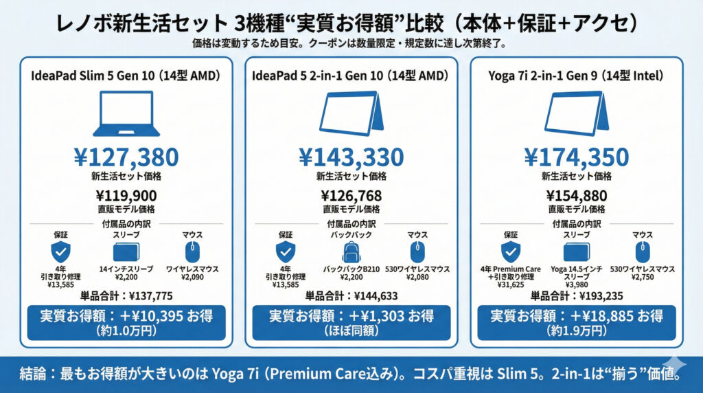 ただし、超早割の“新生活セット”は構成カスタマイズ不可が基本。用途に合っていないセットを買うと、安くても満足度が下がります。そこで本記事では、用途別に「外しにくい」3機種だけ厳選しました。