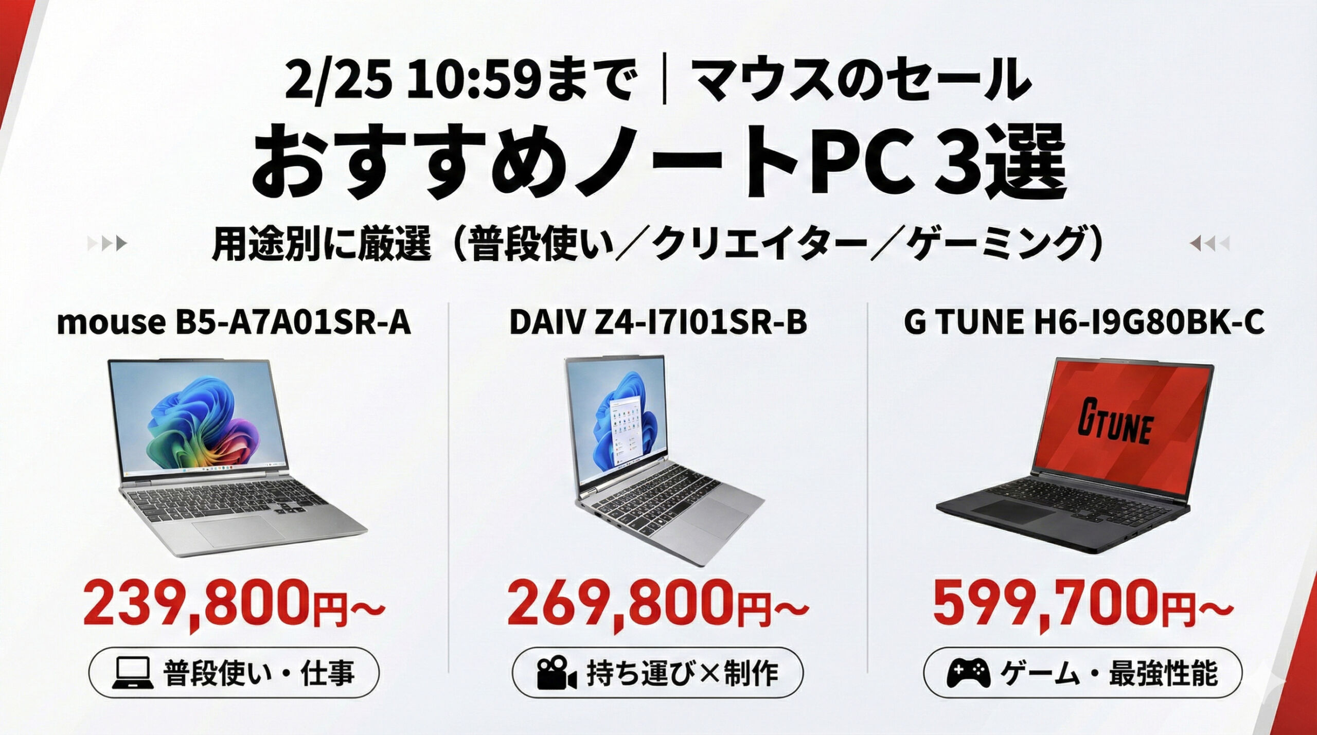A. 「動画編集でRTX必須」「軽さ最優先」「予算10万円台」など、条件が尖っている場合は別解があります。とはいえ、多くの人は今回の3カテゴリ(普段使い/クリエイター/ゲーミング)のどこかに収まります。迷ったら、まずは公式ページのセール一覧から在庫と価格を確認してください。