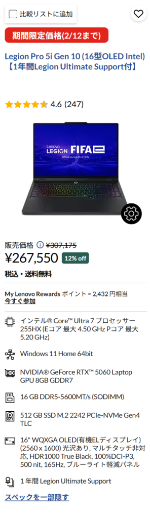 Legion Pro 5i Gen 10は、最新世代の構成を押さえつつ、セールで約26.8万円まで落ちているのが強み。
