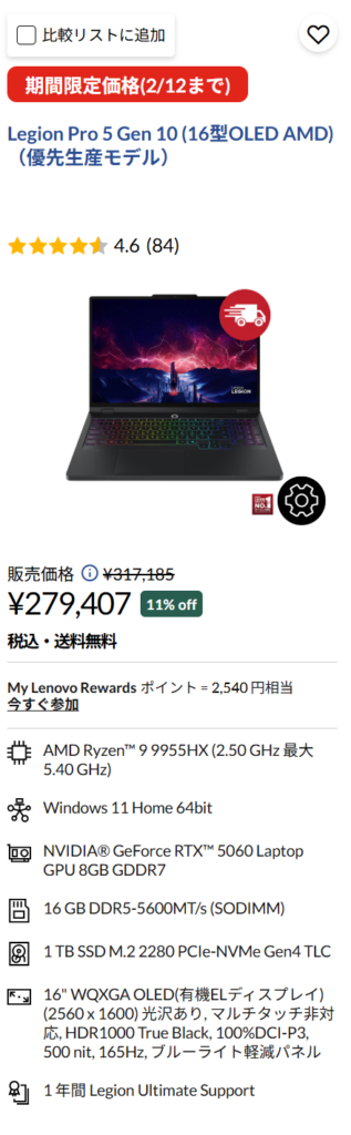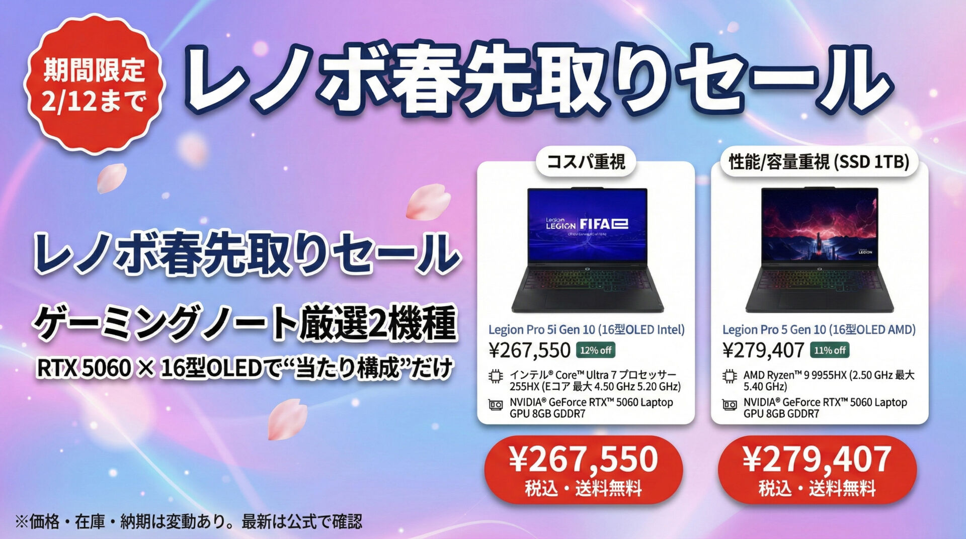 2月12日まで、レノボの春先取りセールではゲーミングノートPCも期間限定価格で狙えるタイミングです。