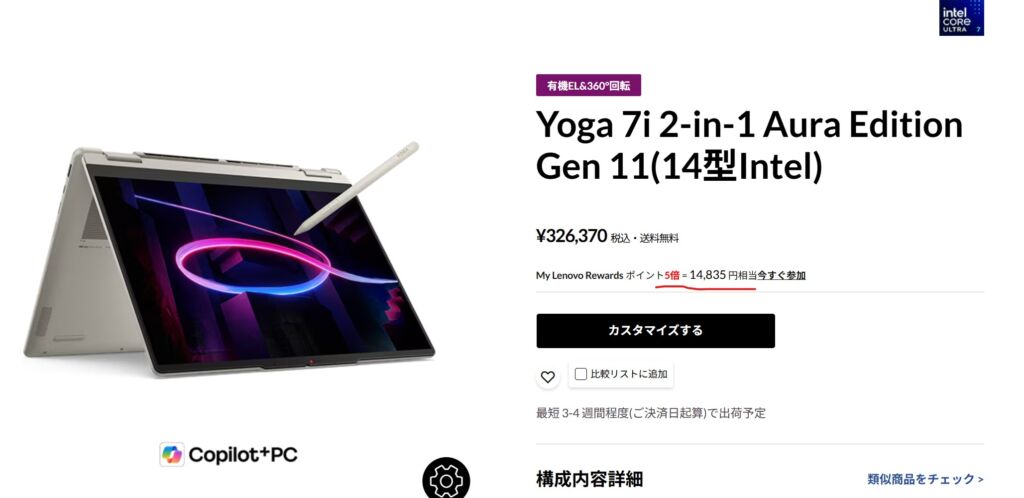 ポイント5倍の対象は、Yoga 7i 2-in-1 Aura Edition Gen 1114型モデル/16型モデルです。