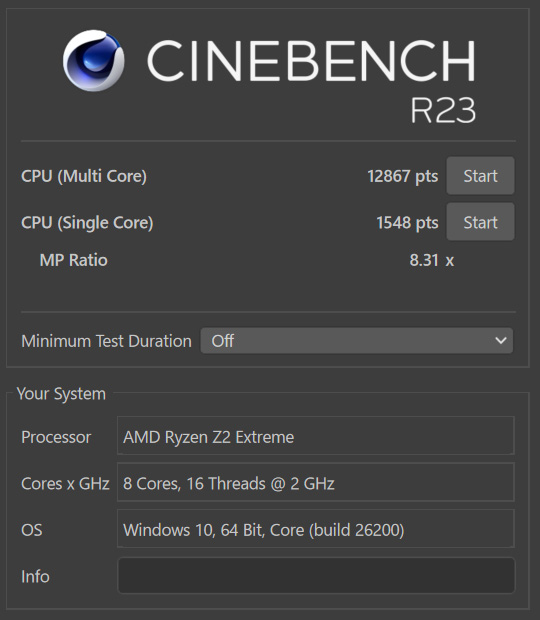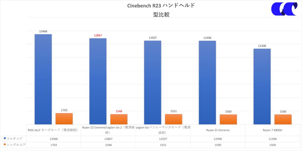 Cinebench R23のスコアは、マルチコア 12,867 pts/シングルコア 1,548 ptsでした(Ryzen Z2 Extreme / 8コア16スレッド)。携帯ゲーミングPC向けCPUとしてはしっかり高めで、ゲームだけでなくWindows端末としての“素の快適さ”も期待できる数値です。