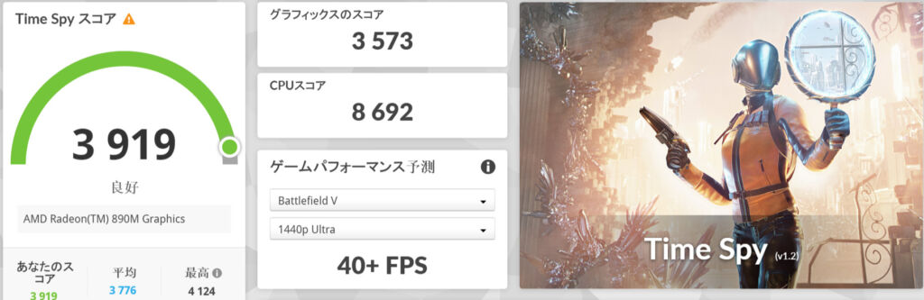 となっており、表示上も「問題なくプレイできます」という判定。携帯機でこのクラスの重量級タイトルをフルHD相当の解像度で60fps超えまで持っていけるのは、純粋にパワーがあります。