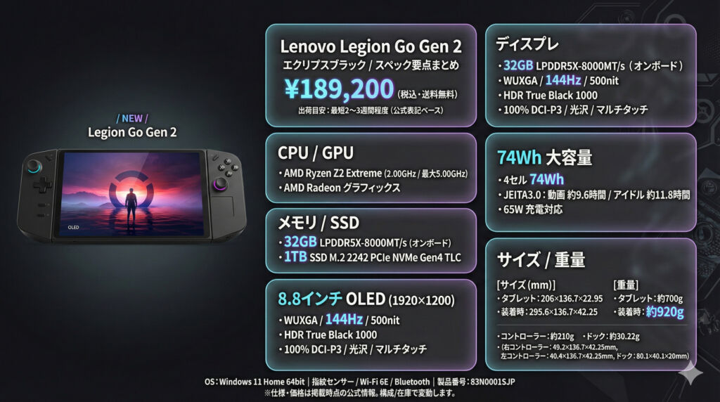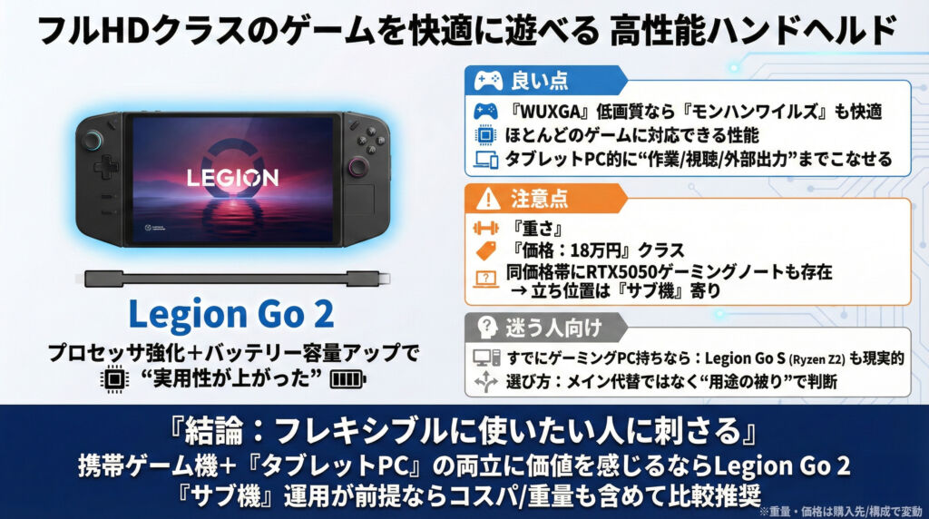 すでにゲーミングPCを持っている人は、価格を抑えたRyzen Z2搭載のLegion Go Sのほうが手に取りやすく、サブ機としては現実的……という見方もできるので、ここは正直悩ましい選択になります。