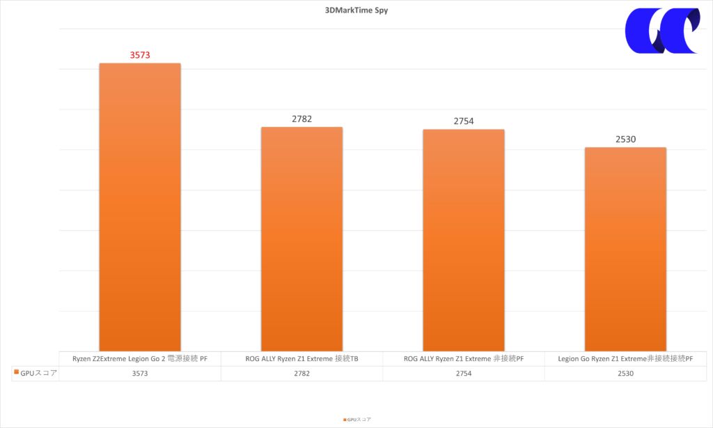 3DMark Time Spyの結果では、GPUスコアの伸びがはっきり確認できました。Legion Go 2(Ryzen Z2 Extreme)はGPUスコア 3,573で、比較グラフ上でも従来のRyzen Z1 Extreme機(2,530〜2,782あたり)より上に来ています。体感としても「同じ設定でもフレームが落ちにくい」「画質を1段上げやすい」方向の進化です。