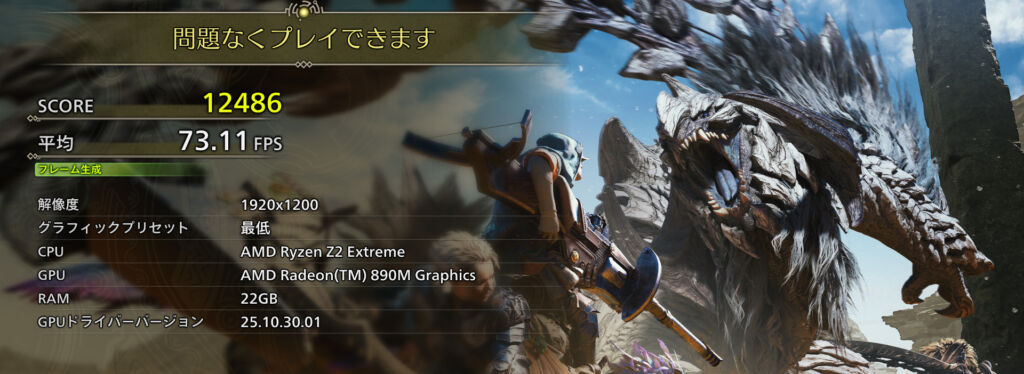 重量級タイトルのモンスターハンターワイルズでも、Legion Go 2は最低画質設定であれば、ネイティブのWUXGA(1920×1200)で快適にプレイ可能でした。