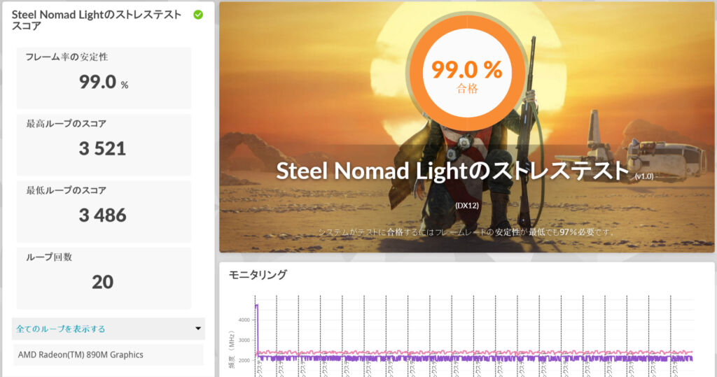 フレーム率の安定性は99.0%で合格判定。20ループ回しても最高3521/最低3486とスコア差が小さく、負荷をかけ続けてもパフォーマンスが崩れにくい結果です。