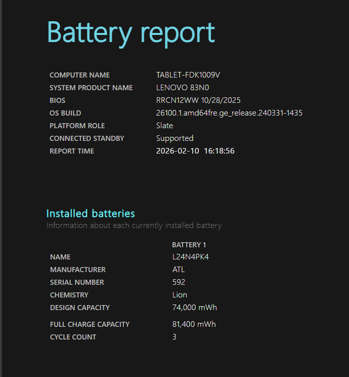 またバッテリーレポート上では、設計容量が74,000mWhで、満充電容量が81,400mWhと表示されており、個体状態も良好でした。