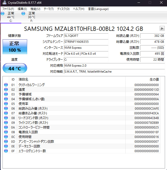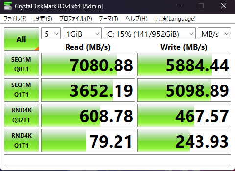 ランダム性能も、4K Q32T1で読み込み 608MB/s/書き込み 467MB/sと良好で、Windows上でのアプリ起動やゲーム中のデータ読み出しもスムーズ。