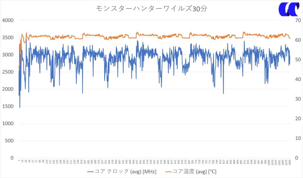30分間の連続プレイ(2秒間隔でログ取得)を見ると、CPUの動作周波数は概ね2.8~3.1GHz前後で推移しており、負荷の変動に合わせて細かく上下しています。途中で2.0GHz前後まで落ち込む瞬間はあるものの、すぐに3GHz近辺へ戻っており、長時間にわたって低いクロックに張り付くような挙動は確認できません。