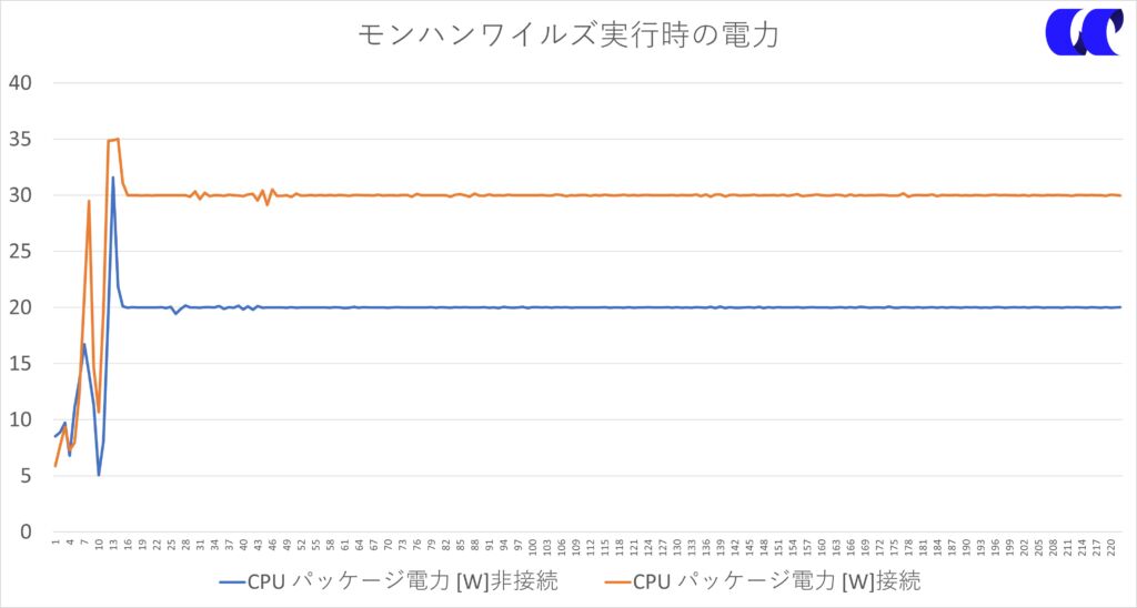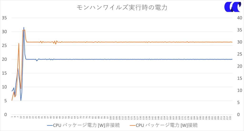 このグラフは、モンハンワイルズ実行中のCPUパッケージ電力を「電源接続(オレンジ)」と「バッテリー駆動(青)」で比較したものです。