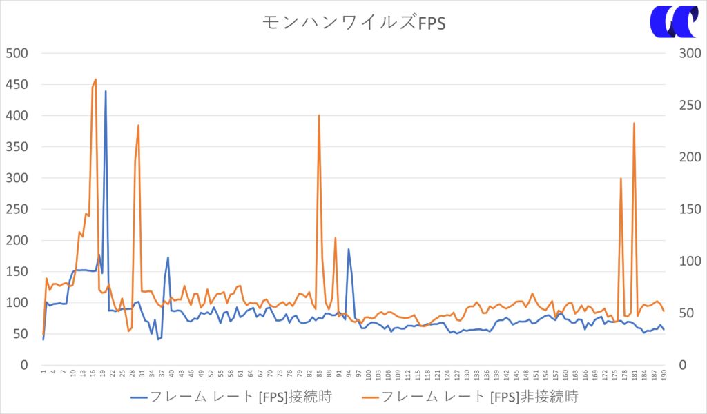 フレームレートは電源接続時のほうが平均で約5~10fps高く、体感でも「もう1段階スムーズ」になります。