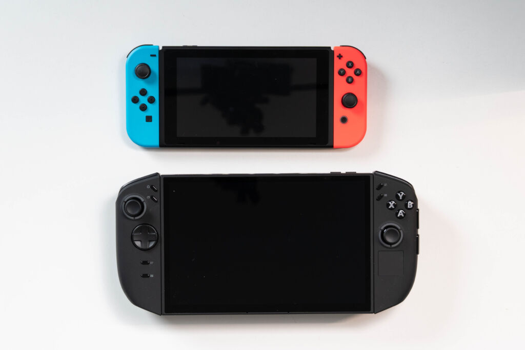 Nintendo Switchと並べると、Legion Go 2はひと回り大きいのが一目で分かります。画面が大きいぶん迫力は出ますが、その分だけ重量感も強めで、気軽に持ち歩くというよりは「腰を据えて遊ぶ」タイプの携帯機です。