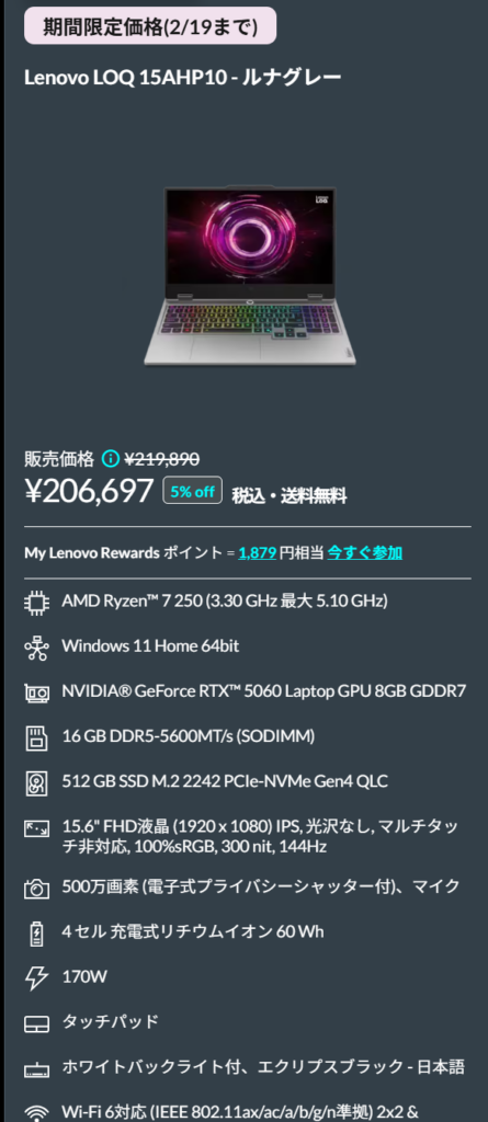 - 20万円前半でRTX 5060に乗る → LOQ 15AHP10