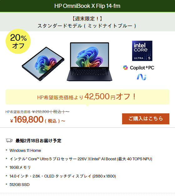 OmniBook X Flip 14-fmが、日本HPのセールで税込16.98万円まで下がっています(希望販売価格から42,500円オフ/週末限定)。