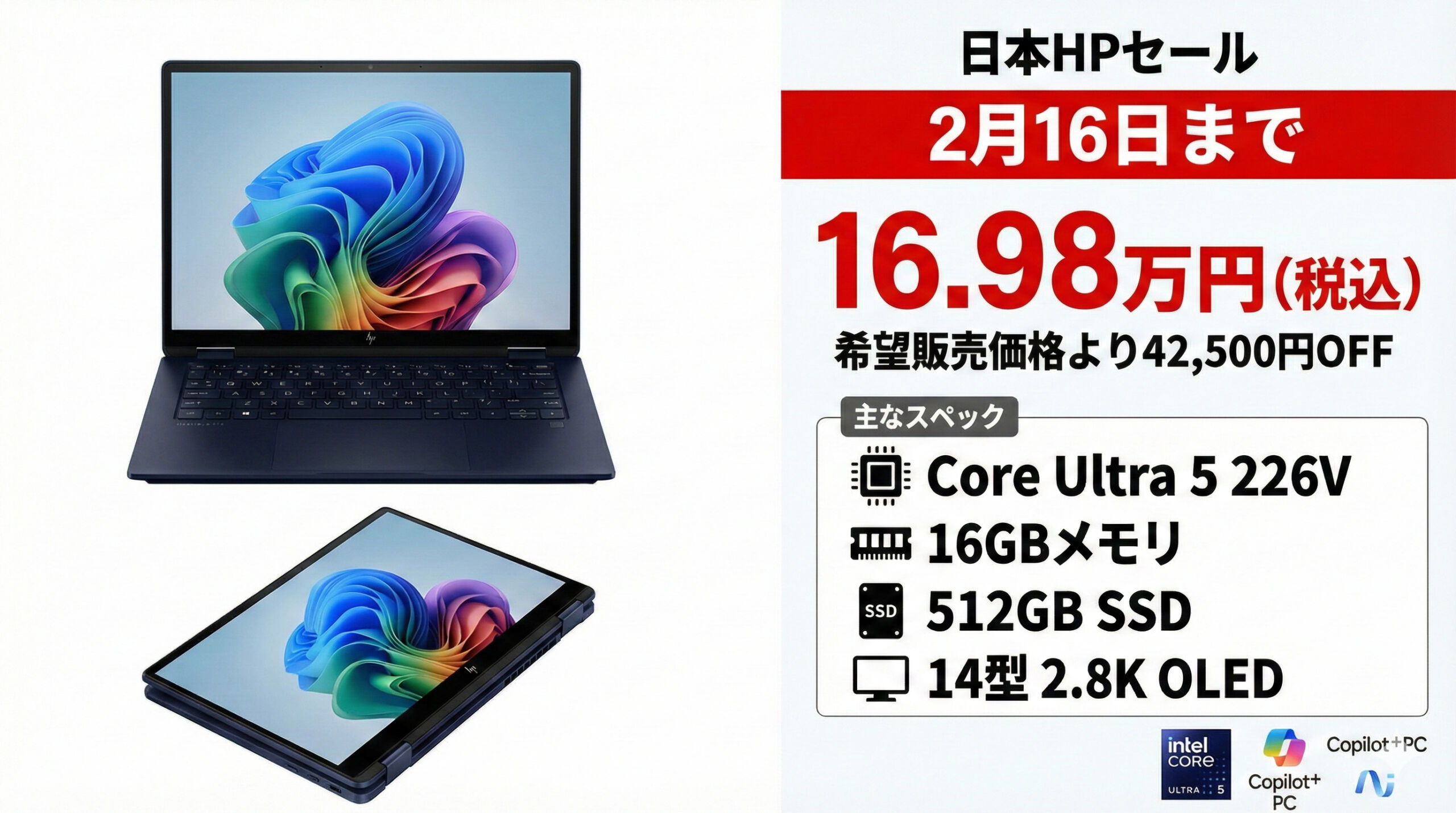日本HPのセールで「OmniBook X」が16.9万円まで下がっています。期間は2月16日まで。