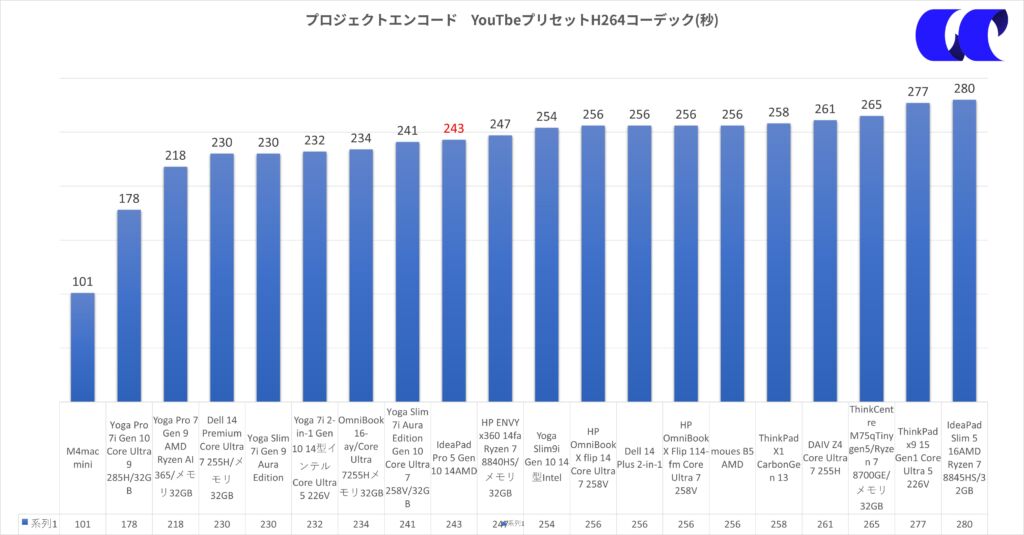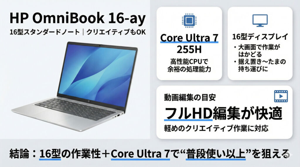 同一CPUでも書き出し時間に差が出る要因としては、冷却性能(長時間負荷でのクロック維持)や電力設定(パフォーマンス/バランス)、メモリ構成やストレージ速度などが影響しやすいポイント。OmniBook 16-ayは“最高速を叩き出す”タイプというより、安定してクリエイティブ作業を回せる実用性能と捉えるのがわかりやすいです。