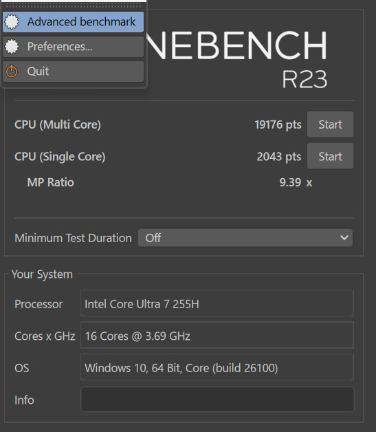 OmniBook 16-ayのCPUはCore Ultra 7 255H。Cinebench R23の実測スコアは、マルチコア:19,176 pts/シングルコア:2,043 ptsでした。