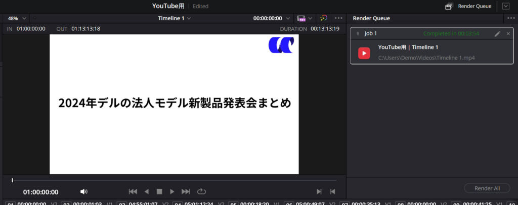 DaVinci Resolveで13分の動画をYouTube向け(H.264)に書き出したところ、完了までの時間は3分54秒でした。