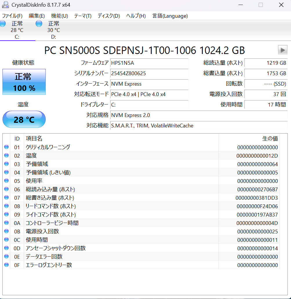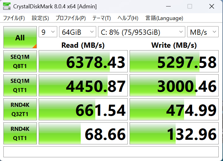 ストレージは**1TB SSD(PC SN5000S / NVMe / PCIe 4.0 x4)**を搭載。CrystalDiskMarkの結果は以下のとおりで、PCIe 4.0世代らしい高速な部類です。