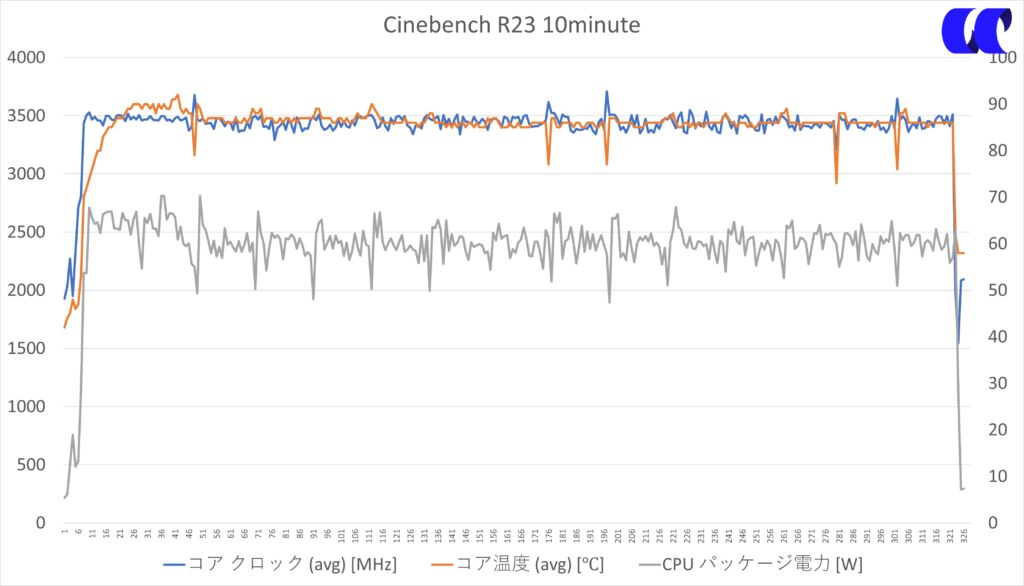 Cinebench R23を10分間連続で回した際の挙動を見ると、CPU温度は概ね80℃台後半(約88℃前後)で推移しました。温度をガチガチに抑えるというより、ある程度の発熱は許容して性能を維持する方向にチューニングされた挙動です。
