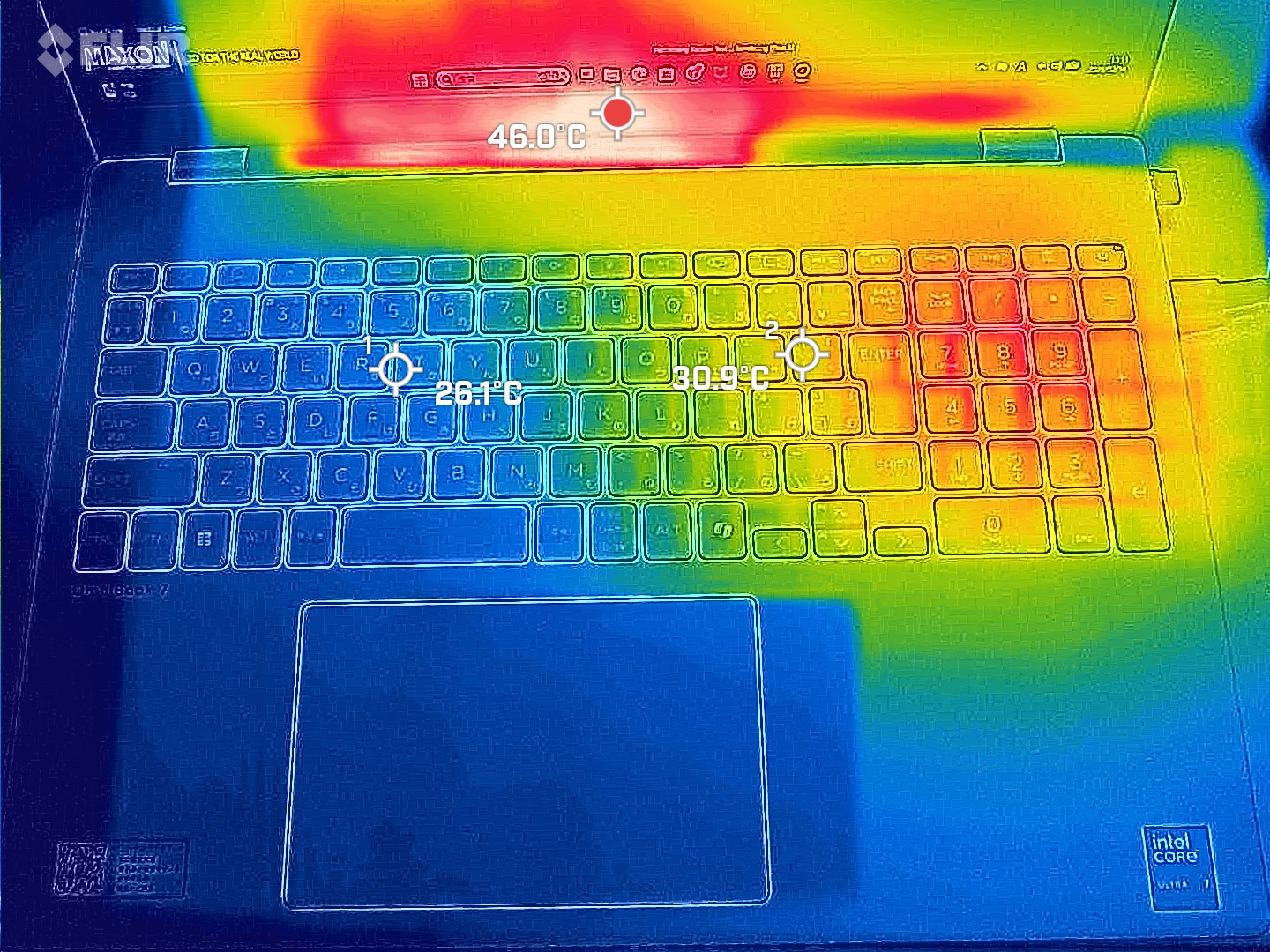 一方で、排気口に近いヒンジ付近は最大46℃前後まで上がるため、負荷をかけた状態では上部が熱くなります。ただ、熱が集中する場所が明確なので、タイピング中の体感としては**“触れる部分は快適、熱いのは上側”**という分かりやすい挙動です。