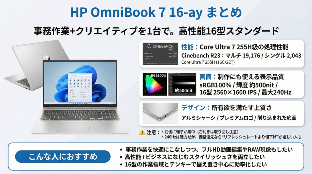 ホームPCHP OmniBook 7 16-ay パフォーマンスプラスモデルレビューCore Ultra 7 255H搭載高性能16型ノートPC
