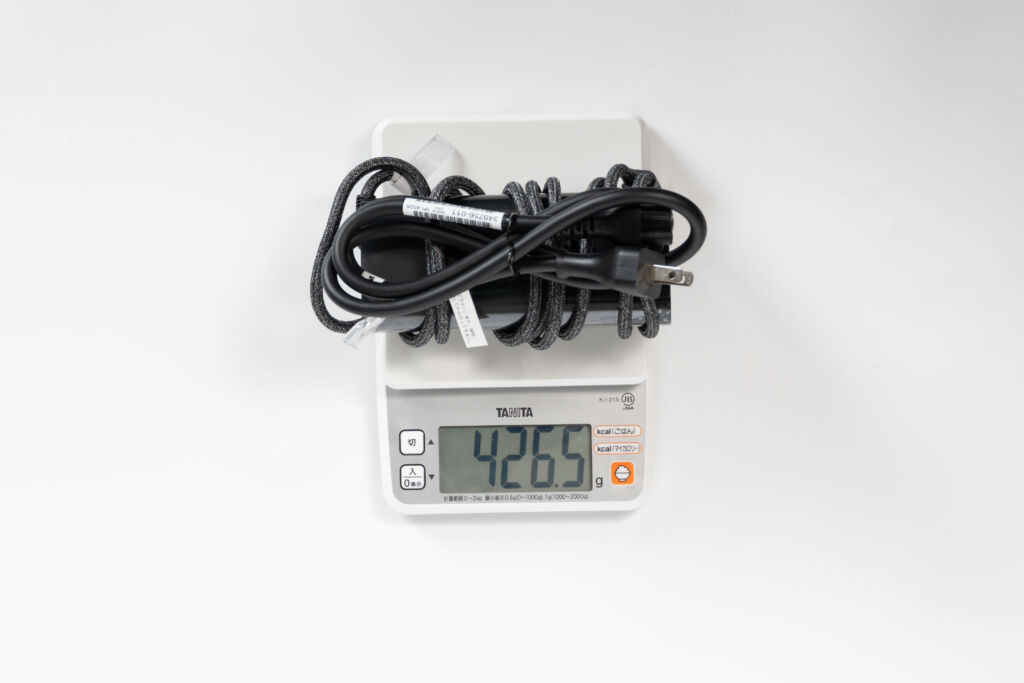 なお、ACアダプターも実測で約426g(写真の表示:426.5g)あるため、外出時は合計で2kgを超えがち。携帯性を重視するなら、14型クラスも含めて検討した方が後悔しにくいです。