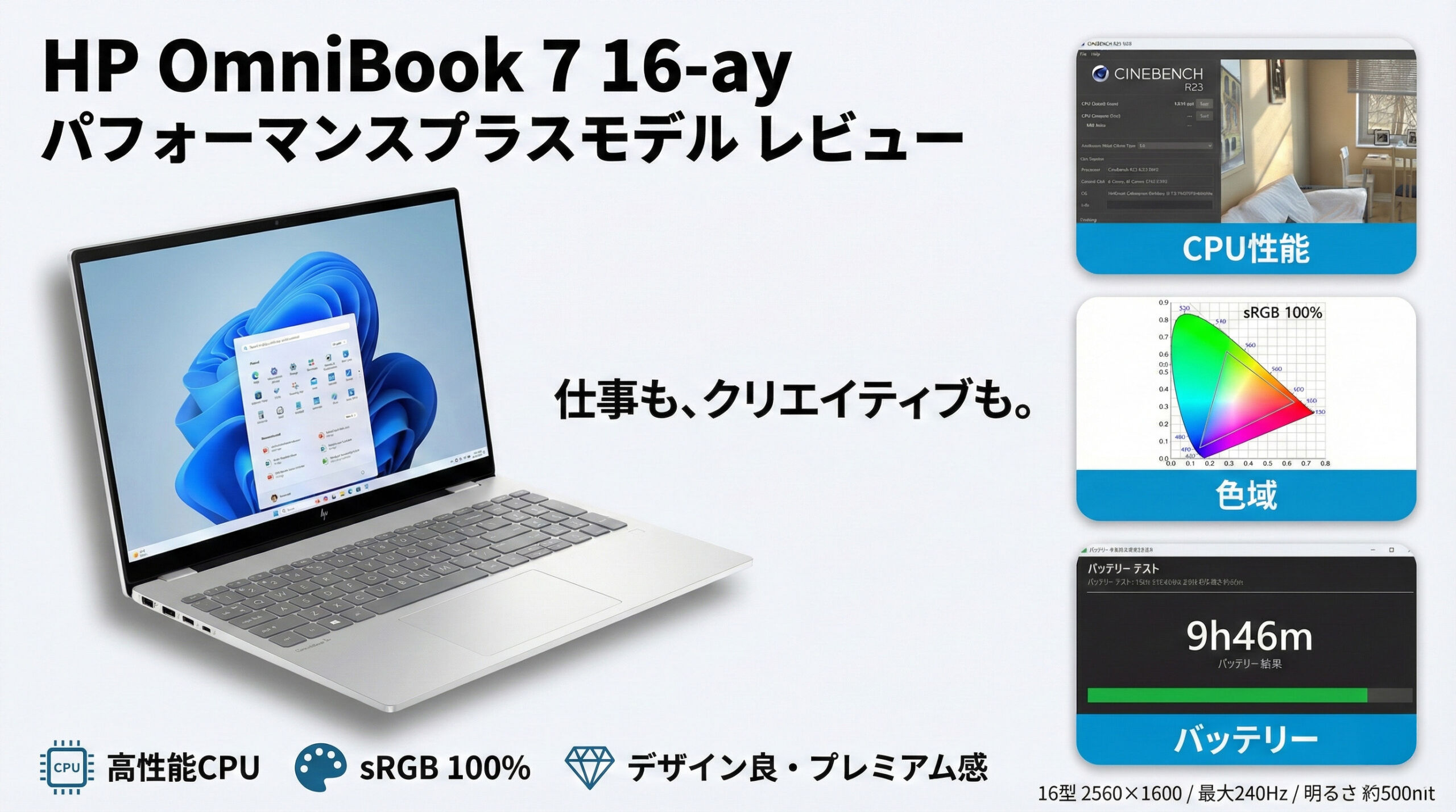 ホームPCHP OmniBook 7 16-ay パフォーマンスプラスモデルレビューCore Ultra 7 255H搭載高性能16型ノートPC