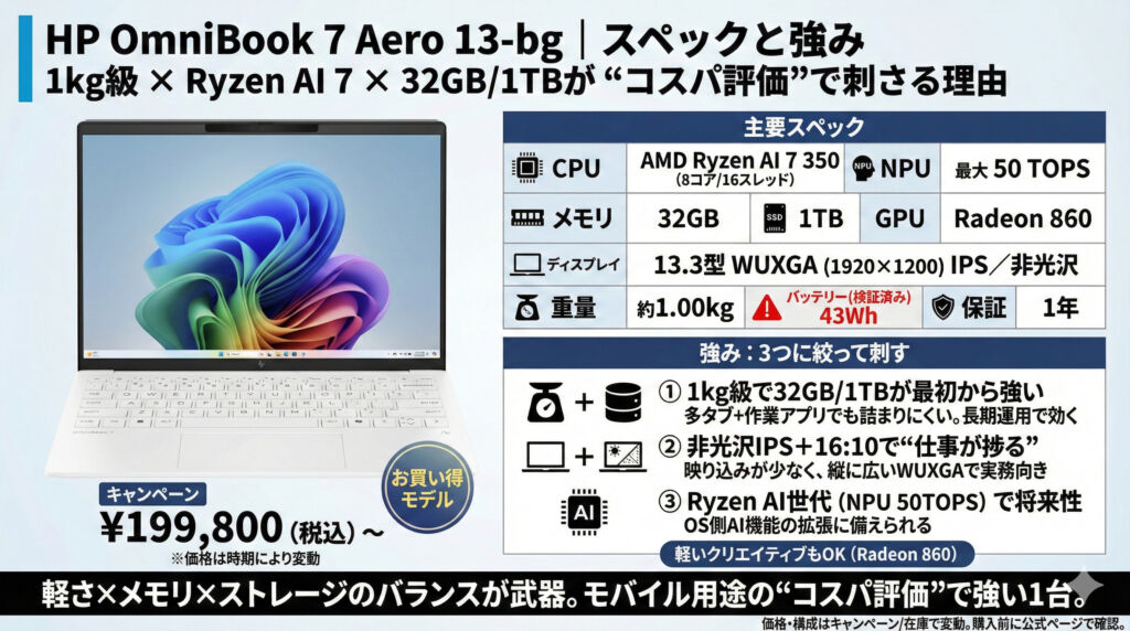HP OmniBook 7 Aero 13-bgは、約1.00kg級の軽量ボディにRyzen AI 7 350(8コア16スレッド)+メモリ32GB+SSD 1TBを搭載した、持ち運び前提でも妥協しにくい高バランスなモバイルノートです。13.3型WUXGA(1920×1200)の非光沢IPSで実務用途に向き、内蔵GPUのRadeon 860も軽いクリエイティブ作業までカバー可能。価格は199,800円(税込)~で、バッテリー容量は43Wh(検証済み)と容量自体は大きくないものの、「軽さ×メモリ×ストレージ」を重視してコスパを取りにいく人に刺さる1台です。
