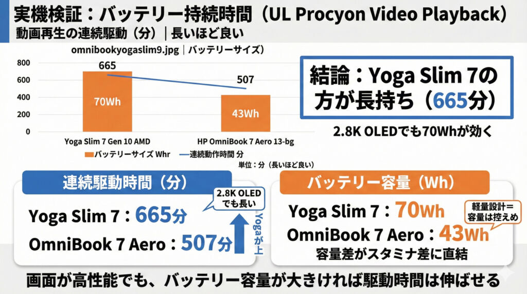 Yoga Slimは2.8KのOLEDを搭載しているため消費電力面では不利に見えますが、バッテリー容量が70Whと大きく、43WhのOmniBook 7 Aeroを上回るスタミナにつながっています。つまり、画面が高性能なモデルでも、バッテリーサイズが十分なら長時間駆動を期待できる、という結果です。
