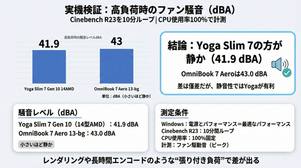 これは日常用途ではなく、レンダリングや長時間エンコードのように高負荷をかけ続けたときの“最大時のうるささ”を見るテストです。結果はYoga Slim 7 Gen 10(14型AMD)が41.9dBA、OmniBook 7 Aero 13-bgが43.0dBAとなり、数値としては僅差ですがYoga Slimのほうが静かでした。