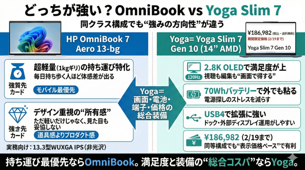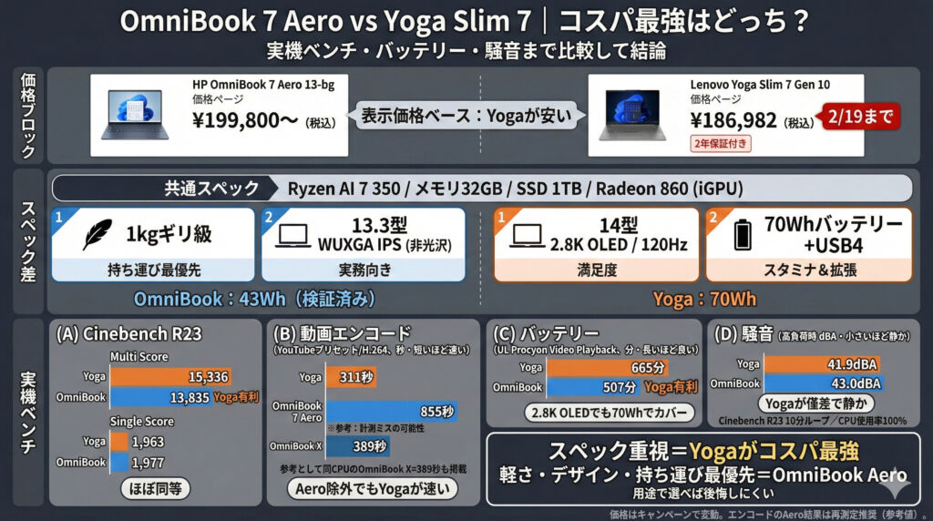 総合すると、画面・バッテリー・端子・価格まで含めた“スペック重視”ならYoga Slim 7がコスパ最強で、毎日持ち歩く前提で軽さとデザイン(所有感)を最優先するならOmniBook 7 Aero、という結論です。