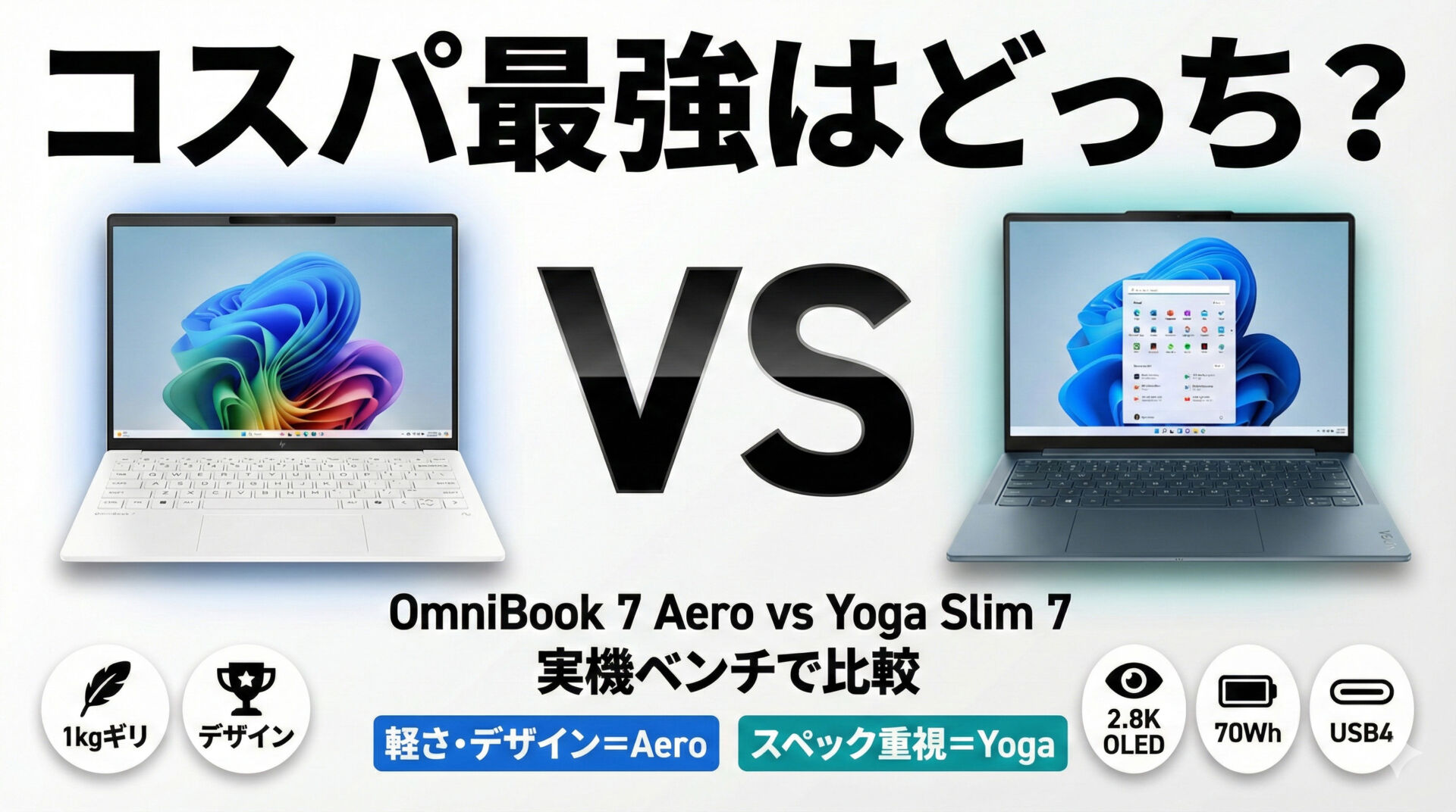 今回の比較は、HP OmniBook 7 Aero 13-bg と Lenovo Yoga Slim 7 Gen 10(14型AMD)を、スペック表だけでなく実機ベンチで「コスパ最強」を決めにいく内容です。