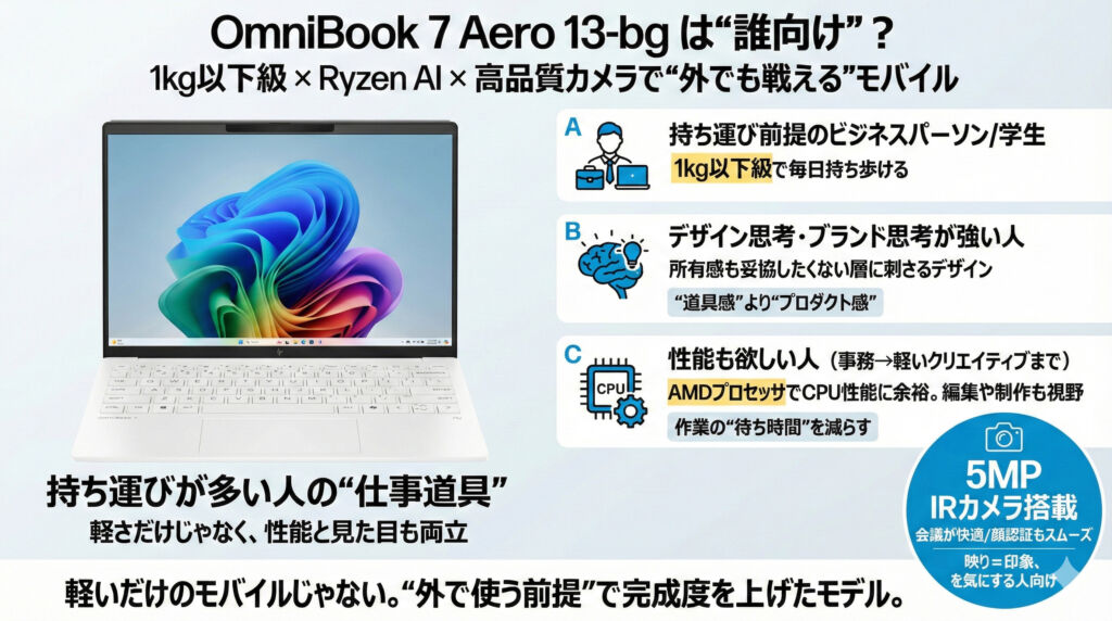 HP OmniBook 7 Aero 13-bgは、1kg以下級の軽さを武器に「持ち運び前提で、外でも家でも同じ生産性を出したい人」に向けて作られたモバイルノートです。主なターゲットは、通勤・出張・大学の持ち歩きが多いビジネスパーソン/学生。さらに、いわゆる“ただ安いPC”ではなく、外観や所有感も重視するデザイン思考・ブランド思考が強い層にも刺さる方向性です。