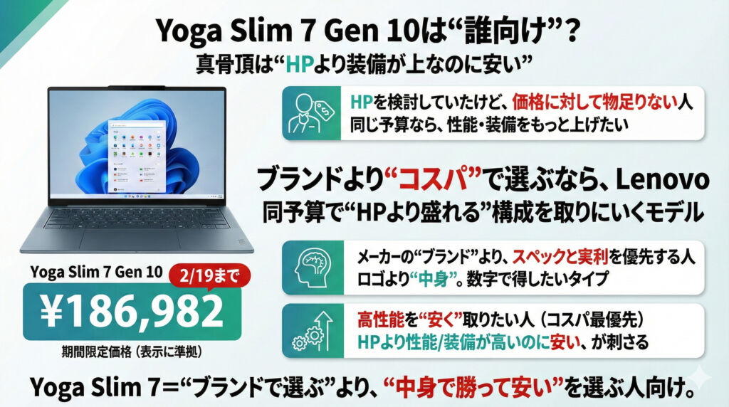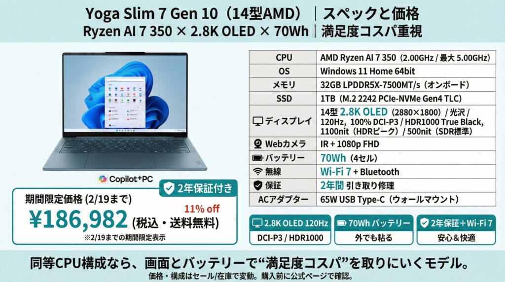 Yoga Slim 7 Gen 10(14型AMD)は、端的に言うと「ブランドの“雰囲気”より、同じ予算で中身を最大化したい人」のために作られています。特に今回の構成は、Ryzen AI 7 350/32GB/1TBに加えて2.8K OLEDや70Wh、2年保証まで乗っていながら、表示価格がHP側より安い条件が成立しているので、狙いは明確に「HPの同価格帯より“性能・装備が上なのに安い”を取りに行く層」です。