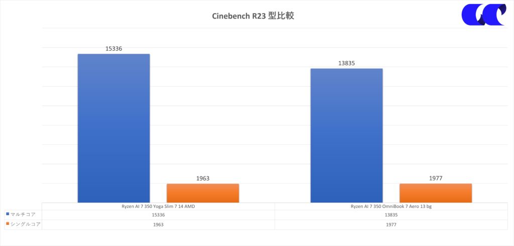 実機でCinebench R23を計測したところ、Ryzen AI 7 350搭載モデル同士でも傾向に差が出ました。マルチコア性能はYoga Slim 7 Gen 10(14型AMD)が15,336pts、OmniBook 7 Aero 13-bgが13,835ptsとなり、Yoga Slim 7のほうが高いスコアを記録しています。
