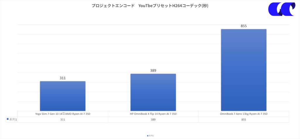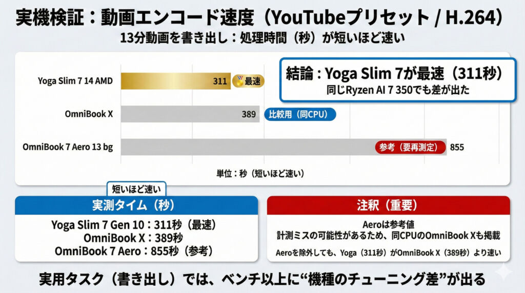 A. YouTubeにアップした13分動画をYouTubeプリセット(H.264)で書き出したところ、Yogaが311秒で最速でした。Aeroは855秒ですが計測ミスの可能性があるため参考値とし、同CPUのOmniBook X(389秒)も併記しています。それでもYoga<OmniBook Xなので、書き出しはYogaが速い結果です。