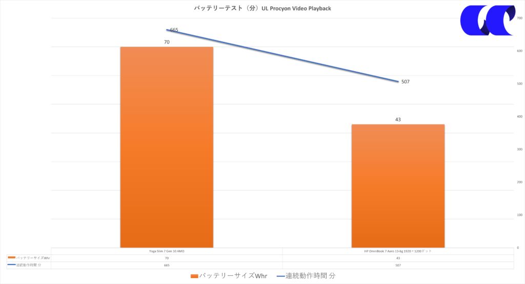 A. Yogaが長持ちでした。UL Procyon Video PlaybackでYoga 665分、Aero 507分。Yogaは2.8K OLED搭載でも70Whとバッテリー容量が大きく、Aeroは43Wh(検証済みのため、容量差がスタミナ差として出ています。